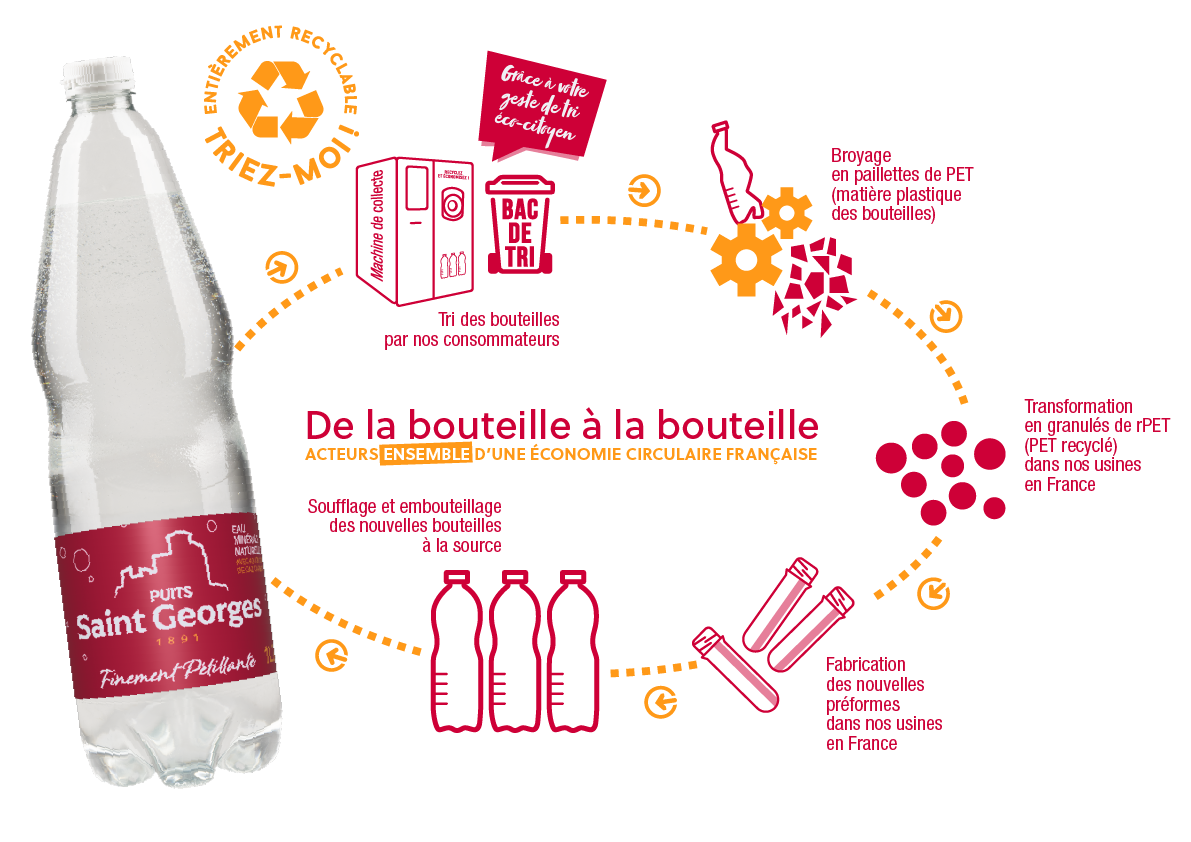 Pour fabriquer du PET recyclé, il est essentiel que le consommateur place la bouteille vide dans le bac de tri pour que la bouteille puisse ensuite être collectée pour recyclage. Le recyclage des bouteilles Puits Saint Georges leur offre une nouvelle vie. Bien triées, ces bouteilles en PET peuvent ainsi être transformées en de nouvelles bouteilles.
