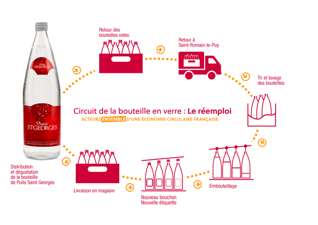 Ce système repose sur la réutilisation des bouteilles, après collecte en circuits courts et lavage sur le site d’embouteillage, permettant de réduire la consommation de nouvelles ressources et de s’inscrire dans une logique d’économie circulaire.